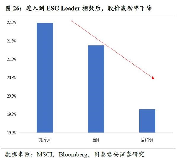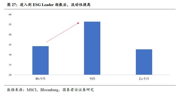 ESG标的拥有更稳定的交易结构:降低换手率、降低股价波动与提高流动性。ESG公司具有稳健的标签,吸引ESG偏好的投资者参与交易,从微观结构改变标的的交易风格。研究发现,进入ESG Leader指数之后,标的的微观交易结构将会发生变化:第一,降低换手率,从进入前1月的月换手率16.94%,降低到进入后2月的16.34%;第二,降低波动率,从进入前1月的月波动率21.99%,降低到进入后2月的19.64%;第三,提高流动性,从进入前1月的流动为44.24,降低到进入后1月为56.45。