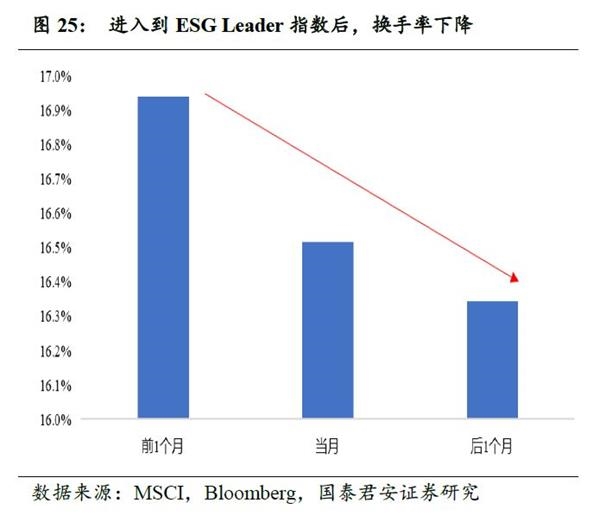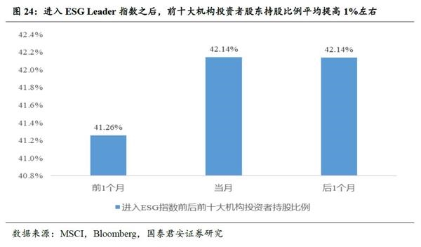 超额收益来源之:机构投资者增加改善交易结构。ESG成分交易结构股改善重要原因是:纳入ESG指数之后,降低了机构投资者对于ESG评级优秀的公司股票的搜索成本,我们发现了机构投资者在标的公司纳入ESG Leader指数后,前十大机构投资者投资比例明显提升。作为机构投资者增加的结果,我们发现成分股标的公司形成了更良好的微观交易结构:交易频次降低、低股价波动与较高流动性。