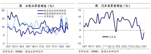 必需消费高位回落。其中食品烟酒类增速降至8.6%,纺织服装类增速降至8.7%,日用品类增速降至11.3%。1-7月必需消费增速9.8%,较17年的8.8%不降反升,指向今年以来必需消费整体向好。