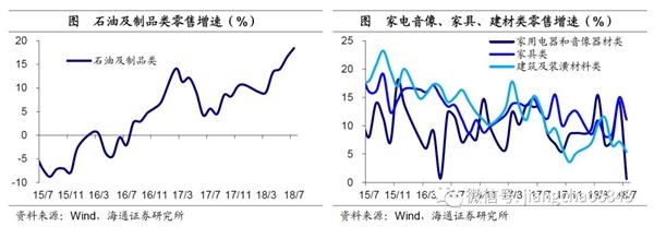 可选消费涨少跌多。其中汽车类零售降幅收窄至2%,石油及制品类增速再创新高至18.4%,地产相关消费普遍回落,家电类增速0.6%几近归零,家具类、建材类增速分别下滑至11.1%和5.4%。1-7月汽车、家电、家具、建材消费增速分别为2%、9%、10.3%和7.6%,较17年全线回落,指向今年以来可选消费普遍低迷。