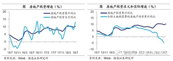 房地产投资仍处高位。1-7月房地产投资同比增速10.2%,较1-6月基本持平,其中7月当月增速升至13%,创17年以来新高。今年以来,房地产投资持续高增长,成为投资的中流砥柱。但房地产投资高增长主要由土地购置贡献,上半年土地购置费增速高达74.4%,剔除土地购置费后房地产投资增速降至-4.9%。而7月财政部口径下,土地出让收入累计同比增速已从6月的43%大幅回落至7月的35.1%,意味着下半年土地购置费增速或将回落,并带动地产投资增速高位下滑。