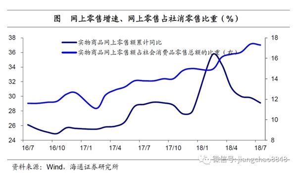 消费领域的亮点依然是网上零售。1-7月实物商品网上零售同比增速29.1%,虽较年初35.6%有所回落,但仍保持在30%左右高位,远高于社会消费品零售总额9.3%的增速,占后者的比重也高达17.3%。