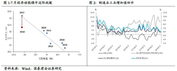 7月以来,经济动能平稳中边际放缓。高频数据来看,7月以来全国高炉开工率平稳,同比增速回落近2个点。发电耗煤增速显著放缓3个点至7.3%。环比看,利用统计局公布的工业增加值定基指数,我们看到18年7月工业增加值指数环比增速(未季调)达历史低位,为-10.1%,与17年7月相同。但17年6月的环比却明显高于今年6月的环比。因此18年7月的环比确实较低。