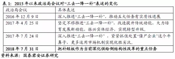 此次政治局会议突出“补短板”。“三去一降一补”由2015年12月的中央经济工作会议首次提出。此后和经济有关的政治局会议都是并列提“三去一降一补”(表1)。“三去一降一补”中,“去产能”集中于2016年底到2017年、(房地产)去库存为2015年、2016年、“去杠杆”在2017年)。剩下了“降成本”、“补短板”两项。“降成本”从财政政策来看更多是减税、降费;从货币政策来看,核心是降低信贷融资成本。