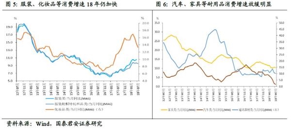 而上述两个影响,在不同类型的消费增速对比中,或许体现得更加明显。从趋势上看,居民消费初步体现出“口红效应”。“口红效应”是指,在不景气的经济现实下,口红等廉价奢侈品的销量反而出现上升的现象。经济衰退虽然降低了消费者的购买能力,但其消费欲望并未减少,人们转而以购买廉价奢侈品的方式满足购物需求,也能在萧条的经济下对自身起到一定的安慰作用。我们看到,18年以来,服装、化妆品等消费增速仍保持了上升的趋势,但汽车、家具等较贵重的耐用品消费增速下滑明显。