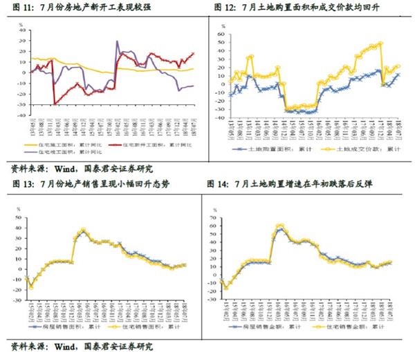 房地产主要指标均表现较好,仍是当前支撑经济的重要组成力量。1-7月全国房地产开发投资累计增速10.2%,增速比1-6月份提高0.5个百分点;商品房销售同比增长4.2%,较上月回升0.9%;土地购置增速累计同比增长11.3%,较上月提高4.1%。房地产开发企业到位资金同比增长6.4%,较上月提高1.8%。房地产开发景气指数为101.88,较上月提高0.20%。房地产各项指标向上,房地产投资全年问题不大。