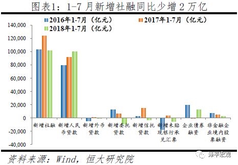 同口径下社融增速继续创新低,7月表外融资缩减趋于平缓。7月新增社会融资规模1.04万亿人民币,较上年少增1242亿元,社融同比增长10.3%(新口径),按可比口径计算同比仍呈下降趋势。在前期紧信用影响下,1-7月信用债违约金额攀升至444亿元,同比增速达125%。7月20日央行发布《关于进一步明确规范金融机构资产管理业务指导意见有关事项的通知》,明显缓和表外融资缩减压力,同时有消息称监管对部分信托公司进行窗口指导,要求相关机构在符合资管新规和实施细则的条件下适当加快部分通道业务的项目投放。政策指导下,7月表外融资缩减力度较6月明显缓和,减少4886亿元,环比少减2030亿元,预计8月表外融资将进一步体现政策效果。