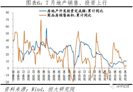 地产投资回升,后期因融资压力、棚改货币化收紧、销售下行等承压。1-7月地产投资同比10.2%,较1-6月上升0.5个百分点。其中,7月地产投资同比13%,较6月上升4.7个百分点,创今年新高。1-7月新开工面积同比上升2.6个百分点至14.4%,其中7月上升14.7个点至29.7%,表明房企正加快高周转。1-7月商品房库存继续去化,但累计同比跌幅收窄至-14.3%,土地购置面积累计同比较1-6月大幅上行4.1个百分点至11.3%。未来房地产调控的重点是防止三四线城市地产库存反弹,和一二线房价反弹。