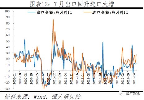 7月出口回升进口大增。7月出口同比12.2%,超预期10%,较前值11.3%小幅上升;进口同比27.3%,较前值14.1%大幅上升。7月美国、欧洲、日本制造业分别为58.1%、55.1%、52.3%,其中美国、日本均有所下降,欧洲基本与上月持平;中国PMI51.2%,连续3个月下降。在内、外需同时走弱的情况下,7月出口超预期小幅上涨的原因在于抢出口、低基数、人民币同比升值幅度缩小;进口大幅上升的原因在于低基数、铁矿砂、原油等资源品价格同比上涨、7月下调关税导致企业扩大汽车进口。