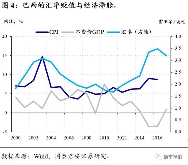 另一种输入型的通胀来自于汇率贬值。以巴西为例,自2013年开始进入了长达三年的滞胀期,巴西雷亚尔的持续贬值是重要原因。汇率输入型通胀,疲软的需求拖累总产出,但是无法下拉通胀,对于外需。自己的工业体系并不完整,使得对于进口需求比较刚性,这也是作为资源国的俄罗斯、巴西比价容易出现汇率型的输入通胀。在这一点上,中国的情况有所不同,一方面中国的工业体系完备,整体是顺差国,对于进口的依赖较小;另一方面,从人行调整远期售汇风险保证金来看,人行的传递出了较为明确的信号,短期内人民币汇率以稳为主。