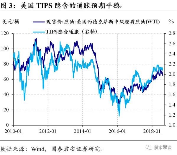 站在目前位置,对于运行的长期趋势尚难做出判断,但是从国际政治的角度来看,很难再出现类似于第四次中东战争的地缘冲突事件,导致石油价格的飙升。而考虑到美国通胀预期与油价的密切关系,我们可以观察到至少在最近一段时间,油价和通胀预期整体平稳。