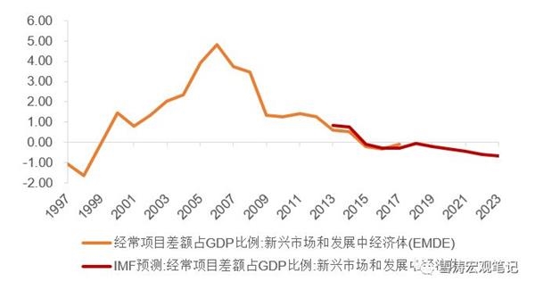 当然历史也不会简单重复。与亚洲金融危机相比,新兴市场自身防御机制加强。1998年,货币升值-出口恶化-汇率贬值是南亚诸国崩溃的逻辑链条,而现在,主要新兴市场国家已从被动跟随美元大幅升值的固定汇率制度转为软盯住或浮动汇率制度,汇率弹性对冲了出口份额下降的隐忧,经常项目/GDP在2017年仍然是0.2%,明显好于1996年的-1.6%。
