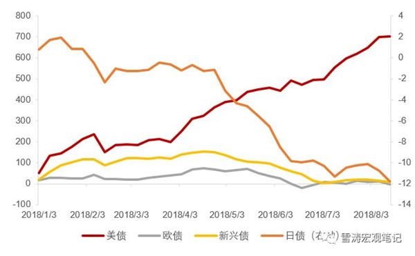 | 图7:2018年以来全球债市资金累计流动情况(亿美元) |