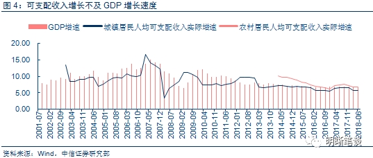 目前,我国人均可支配收入增长慢于经济增长,收入差异拉大。整体来看,我国城镇居民可支配收入实际增速低于GDP增速。近年来,随着GDP增速放缓,我国进入稳增长的发展阶段,城镇居民可支配收入与GDP增速差额收窄,农村居民可支配收入增速高于GDP增速。2018年上半年,上半年,全国居民人均可支配收入14063元,比上年同期名义增长8.7%;扣除价格因素,实际增长6.6%。而我国今年第一季度GDP同比增长6.8%,第二季度GDP同比增长6.7%。此外,不同地区的可支配收入差距较大,从省份看,上海、北京、浙江、天津、江苏、广东、福建、辽宁、山东等9个省市上半年人均可支配收入超过全国14063元的平均线;上半年,居民人均可支配收入超过2万元的省市均位于东部地区,分别是上海、北京、浙江、天津,东西部地区居民收入差距较大。居民财富差距也逐步扩大,据世界银行统计,2016年中国人均财富基尼系数已高达0.789,收入差距扩大影响了消费增长的潜力。