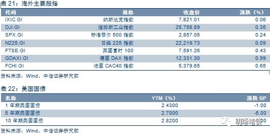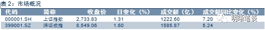 2018年8月21日,银银间质押回购加权利率涨跌不一,隔夜、7天、14天、21天、1个月分别变动-0.2BP、-1.07BP、2.84BP、5.72BP、 16.67BP至2.62%、2.66%、2.95%、3.05%、2.78%。当日国债收益涨跌不一,1年期、3年期、5年期、10年期国债分别变动4.28BP、5.48BP、4.93BP、-0.26BP至2.94%、3.35%、3.47%、3.63%。上证综指收涨1.31%至2733.83,深证成指收涨1.60%至8549.06,收涨1.48%至1456.97。