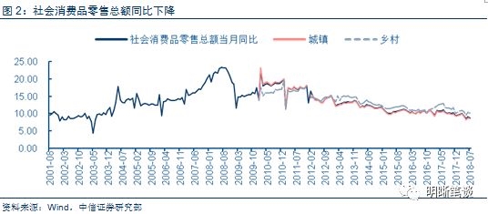 尽管如此,从目前来看,消费增速并不乐观。从社会零售总额来看,增速从2008年以来开始下滑,在金融危机之前,随着经济的发展,人民生活水平的提高,社会零售总额增速在2008年7月达到了最高点23.3%。此后受到了金融危机的影响,增速开始下滑,虽然在2010年增速有所回升,但是总体呈下行趋势,增长乏力,2018年7月份社会零售总额的增速已经降至8.8%。