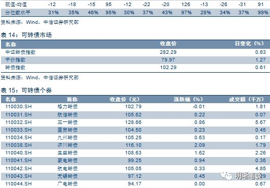 本周二沪深两市同向变动,尾盘上证综指上涨1.31%,上涨1.60%。上周受正股拖累中证转债指数录得小幅下跌,虽然从跌幅的绝对值来看转债市场表现了一定的抗跌性质,但其背后核心原因在于转债市场整体平均价格已经处于绝对低位,一定程度上限制了下行空间。在前述近两个月的周报中我们曾反复提示转债市场内生指标未处于最佳位置,而股市也持续遭受冲击,不妨多一分耐心静待转机,低仓位仍旧是相对占优的选择,溢价率仍是左右市场走势的核心因素。回归当下,在股市持续调整的背景下,我们想要重点强调两点:一是转债整体溢价率仍未修复至目标区间,多数标的并不具备充足弹性,因此即使正股出现反弹机会,多数转债标的性价比仍偏低,无需冒进;二是溢价率分化的迹象仍在趋严,虽然少数存量股性标的溢价率满足目标区间,但仍受制于数量以及流动性,而债性标的占比则继续维持在高位。另一方面,近期新上市个券纷纷破发,不少标的价格突破其面值,我们认为主要原因来自于市场的悲观预期过度压制溢价率水平,而此情况或在短期内延续。具体策略层面,短期而言转债市场并不具备充足性价比建议无需冒进,中长期而言则还需静待正股起稳后做进一步判断。具体标的建议关注东财转债、三一转债、崇达转债、星源转债、景旺转债、博世转债、新凤转债、安井转债以及银行转债。