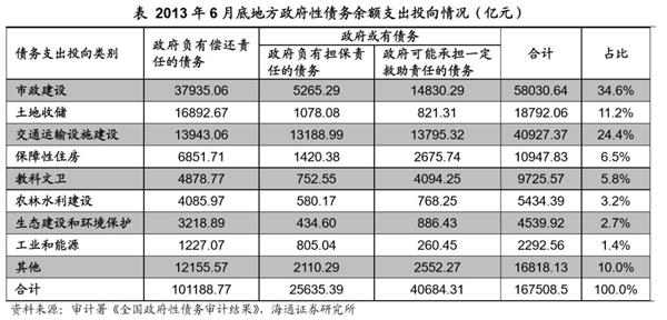 截至13年6月底,全国用于交通运输设施建设的债务余额总规模为4.1万亿元,占总债务余额的24.43%,其中负有偿还责任的债务1.4万亿,占地方政府负有偿还责任债务总计的13.78%。根据这一比例估算,截至18年6月底全国因交通运输设施建设形成的负有偿还责任的债务规模或有2.3万亿,或有债务规模可能会更多。