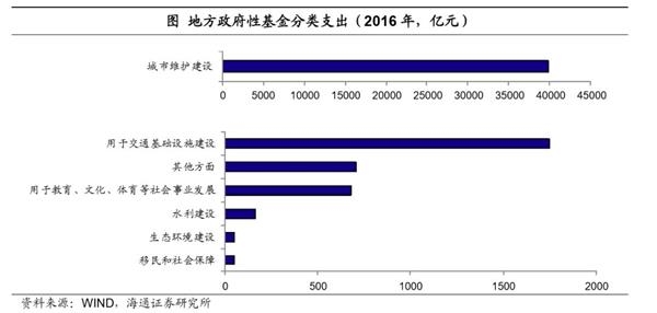 地方政府性基金支出大部分属于基础设施建设支出。政府性基金支出是一般公共财政的重要补充部分,具体来看,政府性基金支出主要涉及交通设施、水利设施、城市维护、公共事业发展、移民和社会保障、生态环境建设7大类支出,除了土地出让金相关支出中的拆迁补偿外(该项占2014年政府性基金支出的42%,2015年以后未公布土地出让金支出细项),大部分都属于基础设施建设支出。