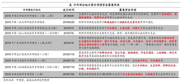 专项债将主要补充基建资金来源。1)存量地方债投向:存量地方政府债务投向中,市政建设、交运、土储和保障性住房债务占比较高,多数省份这几项的占比能达到60%-70%。2)专项债将主要补充基建投资资金。具体到地方专项债,其资金纳入政府性基金预算管理,对应的支出主要涉及交通设施、水利设施、城市维护、公共事业发展、移民和社会保障、生态环境建设7大类支出,除了土地出让金相关支出中的拆迁补偿外大部分都属于基础设施建设支出。3)专项债募集资金具体投向:地方专项债又可分为专项债和项目收益专项债,后者需直接对应项目资产和收益,是前者的细化品种,新增专项债和项目收益专项债发行量之比2017年大概是2:1,今年项目收益专项债的比重预计还会增加。募集资金投向看,专项债募集资金多用于市政建设、交通运输、保障性住房建设安居工程等基础设施建设领域,也用于乡村振兴、扶贫和生态环保等三大攻坚战有关项目;项目收益专项债则分为土地储备、收费公路、棚改、轨交、教育类等多个细分品种,且在不断创新中。