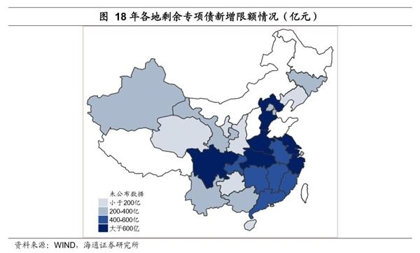 但是一个地区基建投资需求量大、增长快,并不意味着它有较大的融资空间。靠举债支撑的基建投资往往形成巨额债务,地方债务风险也就越大。出于控制风险的角度,像贵州、辽宁、宁夏、海南、青海这些地方政府负债率很高的地区,每年新增的债务限额都非常少,2018年这5个省份地方债务总额新增限额均在300亿以下,而像江苏、广东、浙江等地区新增额度都在千亿以上。