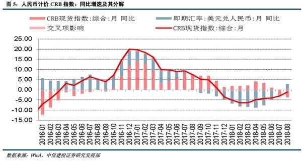 今年以来,人民币对美元贬值5.9%左右,但同期美元计价CRB指数下跌4.6%左右,相当人民币计价的是商品价格指数只是上升1.3个百分点左右,涨幅明显低于人民币贬值幅度。对于人民币贬值较为明显的8月份,人民币对美元月均值同比贬值2.8个百分点,相较上月扩大3.6个百分点;而美元计价CRB指数月均值同比下跌3.7个百分点,跌幅扩大1.5个百分点;综合两项考虑,8月人民币计价CRB指数月均值同比下跌0.9个百分点,跌幅缩窄2个百分点,这要低于人民币汇率贬值幅度扩大的程度(3.6个百分点)。