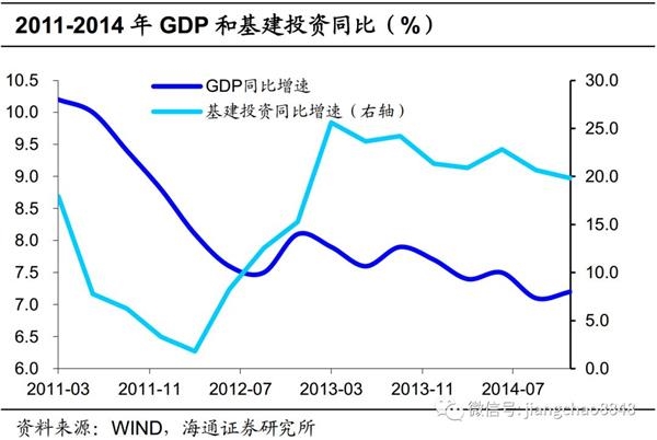 而与09年相同的是,12年的货币宽松也很快带来了信用的扩张。信贷增速由12年初的15%左右回升至9月的16.3%左右,M2增速从12年年初的12.4%回升至9月的14.8%左右。信贷扩张带来了经济的企稳回升,GDP增速从12年二季度的7.6%回升至四季度的8.1%,其中基建增速从12年一季度的1.8%左右大幅上升至年底的15%左右。从2011年12月初降准开始,货币宽松领先信贷和M2回升也在2-3个月左右,领先经济回升两个季度左右。