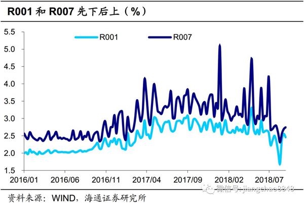 资金中枢下移。7月以来,资金先下后上,货币利率中枢相比上半年明显的下移,其中R001一度处于2%以下的低位,R007与央行7天逆回购利率(2.55%)也出现倒挂。