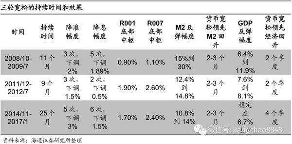 从以往三轮货币宽松中可以发现以下几个特点:1)外部风险和内部经济下滑是货币宽松开启的主要原因,政策往往以降息降准为主;2)货币宽松之后会带来信用扩张,然后经济通胀企稳回升,货币宽松终结,成为一个周期;3)宽松对经济的刺激效果越来越弱,时滞也越来越长。例如09年的宽松使GDP增速从6.4%回升至11.9%,时滞在半年左右;12年的宽松使GDP增速从7.6%回升8.1%,时滞也在半年左右;而15年的宽松只是结束了GDP下滑的趋势,稳定在6.7%左右,并且时滞达到一年。相对应的宽松周期就越来越长,上一轮宽松周期从14年11月降息开始,到17年1月上调MLF利率位为止,持续时间超过了2年。
