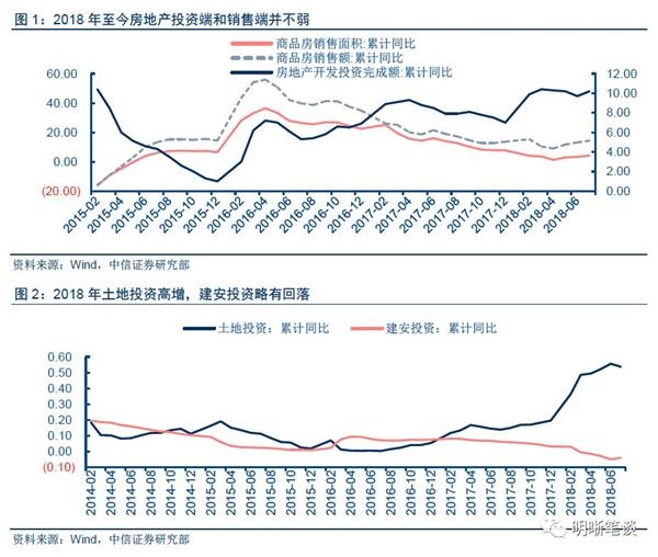 从投资端看,土地投资的高增以及2017年购置土地在今年转开工是房地产投资维持高增的重要原因。今年房地产投资中土地投资占比提升,贡献了房地产投资的大部分增速,分项来看,1-7月房地产建筑安装工程投资同比增速-4.10%,而包含土地投资在内的其他费用同比增速为53.76%。另外,2017年房地产开发商拿地积极,前期的待开发土地今年逐步转为建筑安装投资,从本年土地成交价款和本年购置土地面积看,2017年同比增速分别为49.40%和15.8%,二者均为2011年以来最高值,房地产正常开工使建筑安装工程投资并未断崖下滑。从销售端看,当前销售端高增是房企提高周转率的结果,因此与传统上房地产销售对开发的领先性有所脱节,调控政策将影响房企后续开工的积极性。若融资渠道未明显改善,一方面将影响后续拿地,另一方面也将对后续开工投资产生影响,甚至造成土地资源的空置损失。