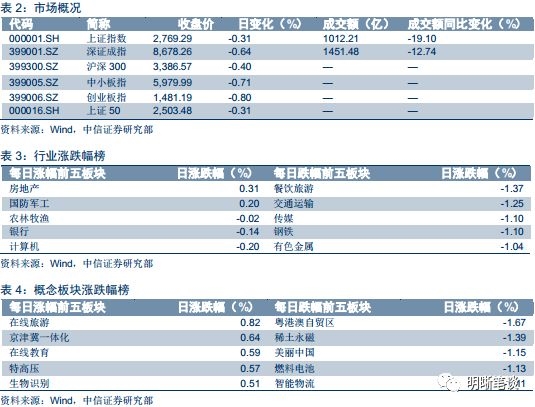 2018年8月29日,银银间质押回购加权利率涨跌不一,隔夜、7天、14天、21天、1个月分别变动-2.35BP、-0.31BP、2.46BP、6.82BP、 -42.27BP至2.37%、2.63%、2.60%、2.69%、2.45%。当日国债收益大体下行,1年期、3年期、5年期、10年期国债分别变动-0.77BP、-0.87BP、-0.44BP、0BP至2.86%、3.30%、3.40%、3.61%。上证综指收跌0.31%至2769.29,深证成指收跌0.64%至8678.26,收跌0.80%至1481.19。