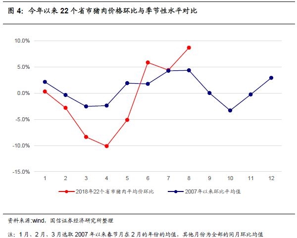 从高频数据来看,今年6月以来猪肉价格环比超越了季节性水平,特别是8月,叠加了非洲猪瘟疫情的影响,猪肉价格超越季节性较为明显,引发市场对通胀的担忧。