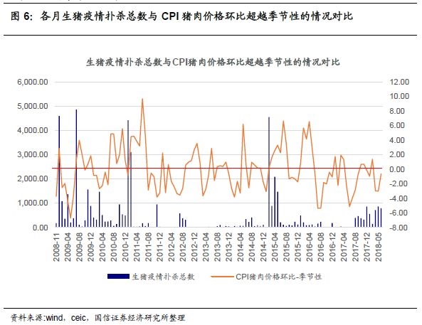 根据上述分析,受疫情影响,猪肉价格平均每月涨幅对食品价格环比的额外贡献最大为0.6个百分点;受下半年异常气候影响,蔬菜价格平均每月涨幅对食品价格环比的额外贡献最大为0.4个百分点,因此后续若非洲猪瘟疫情继续发酵,且异常气候对蔬菜价格的影响较大,则猪肉和蔬菜价格超越季节性的部分额外对CPI食品环比的贡献最大约为1%。