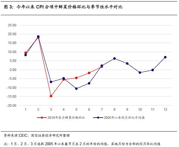 从高频数据来看,今年以来仅5月和6月蔬菜价格超越了季节性水平,7月蔬菜价格是低于季节性水平的,8月截止17日的数据仅略高于季节性水平,但考虑下旬寿光洪灾等天气因素影响,8月蔬菜价格应该超越季节性水平。