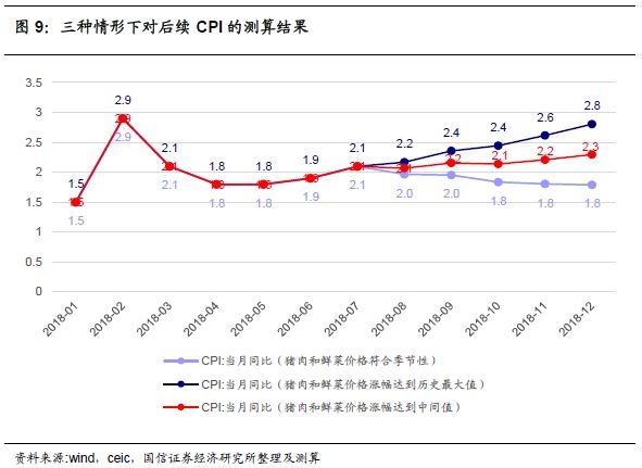 根据历史情况分析,受疫情影响,猪肉价格平均每月涨幅对食品价格环比的额外贡献最大为0.6个百分点;受下半年异常气候影响,蔬菜价格平均每月涨幅对食品价格环比的额外贡献最大为0.4个百分点,因此后续若非洲猪瘟疫情继续发酵,且异常气候对蔬菜价格的影响较大,则猪肉和蔬菜价格超越季节性的部分额外对CPI食品环比的贡献最大约为1%。
