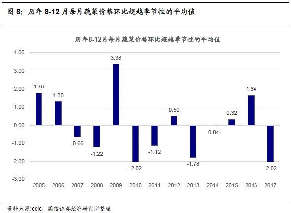 根据历史数据,历年8-12月蔬菜价格有涨有跌,将五个月的环比减去季节性再平均来看,2005年至2017年,有六年的平均环比涨幅超越了季节性水平,其中2009年超越幅度最大,平均每个月超越3.38个百分点,每个月对食品环比(新口径)的额外贡献约为0.4个百分点。