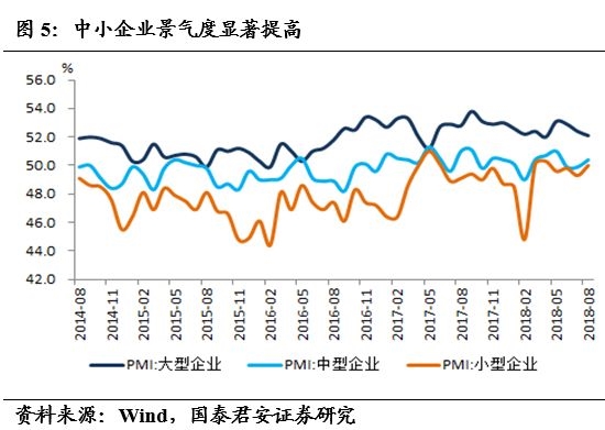 分企业类型看,本月较上月比,虽大型企业PMI为52.1%,比上月回落0.3个点。但中、小型企业PMI显著提升,分别比上月上升0.5和0.7个点达50.4%和50.0%。