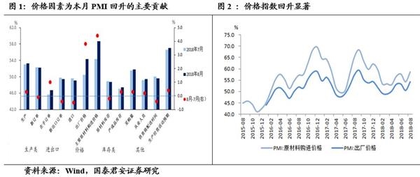 从结构看,价格因素为PMI本月回升的最大贡献。本月较7月比,PMI出厂价格指数上升3.8个点至54.3%,PMI主要原材料购进价格指数上升4.4个点至58.7%,是本月PMI回升的主要贡献因素。与此相应的是,本月南华工业品指数环比上升6.1%,环比增速较7月有明显提升。而这其中,钢价或贡献了主要因素,本月螺纹钢价格环比上升7.1%,较7月环比0.4%大幅改善。或与部分城市提前开启的环保限产有关。