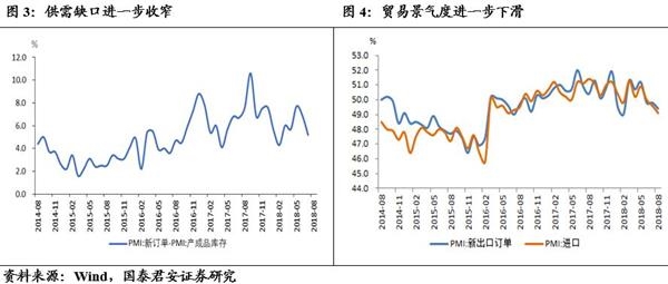 产成品库存继续增加,供需缺口继续收窄,被动加库存迹象仍存。本月产成品库存指数继续上升0.3个点至47.4%,新订单与产成品库存之差则进一步收窄至4.8个点,自4月以来已不断收窄,经济“被动加库存”的迹象仍存。