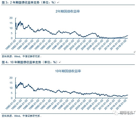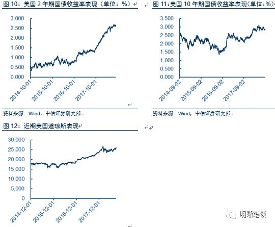 根据过去五次加息周期的经验来看,美国股市在结束新一轮加息周期后走熊风险不大。通胀方面,美国最近有一定上行压力,7月份CPI同比上涨2.9%,与6月持平,为2012 年2月以来最大增幅。股市方面,道琼斯指数于2015年8月1日25666点开始上行,并呈持续走高态势。债市方面,长端10年期国债收益率于2015年2月2日1.68%开始抬起,短端2年期国债于2015年10月14日0.47%开始走高。就业方面,美国目前失业率处历史低水平。目前,美国经济呈稳定增长态势。2015年12月17日美联储开始本轮第一次加息,为2006年始长达十年的宽松货币政策画上句号。美联储曾在去年九月称,预计2018年将加息三次,2019年将加息两次。历史上最长加息周期为17个月,而近两次加息周期均在一年左右,所以我们预计,本轮加息周期将在2019年进入末期。