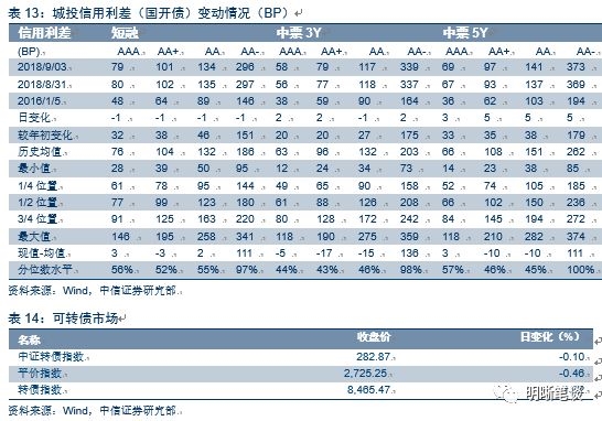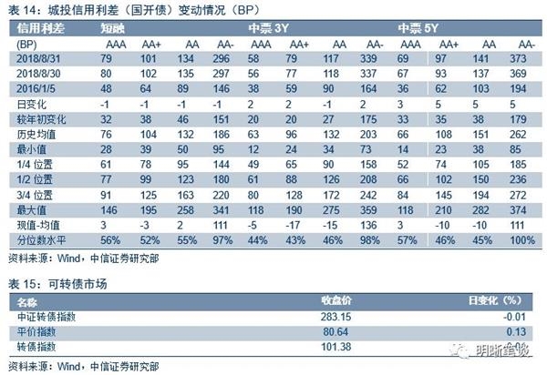 8月31日,债券收益短端全部走平。 AAA中票1Y走平,3Y走平,5Y下行3BP;AA中票1Y走平、3Y走平、5Y下行3BP;AA-中票1Y走平、3Y上行5BP、5Y上行2BP。