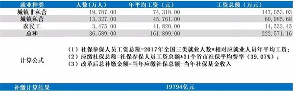 根据31省市平均社保总费率39.07%,我们计算得到应缴社保金额为86,947.78亿元,与2017年社保基金收入差额等于19,794亿元,即为补缴总金额:
