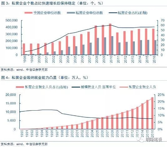 改革开放四十年以来,民营经济由小到大、由弱到强,无论从经济贡献、投资占比、吸纳就业各个方面看均成为推动经济增长的重要力量。私营企业不断成长、民营经济持续壮大的历史进程并不是一帆风顺、线性发展的,在经济本身的周期性下,民营经济在壮大外延的趋势中也难免承受挫折。过去两年多的时间里,供给侧结构性改革和去杠杆的深化推进对经济运行的影响逐步显现,原本在金融放松周期内背靠低价资金进行大幅举债加杠杆经营以及去产能背景下相关行业景气度下行的企业受到较为强烈的冲击,私营企业和民营经济在这一过程中遭受重创,是金融收紧阶段的典型体现,“国进民退”这一现象背后还有一些结构性问题值得探讨。