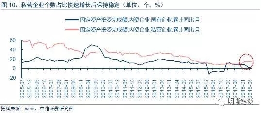 另一个不支持国企和民企二元对立的证据在于固定资产投资的分化。2016年去产能阶段,国有企业固定资产投资完成额增速大幅下滑,民营企业固定资产投资则保持较为稳定的增速。在投资拉动型的经济增长模式下,国有企业投资和基建投资一直以来是我国宏观调控的主要手段之一,参考2008年金融危机后的强刺激政策下国有企业固定资产投资完成额出现大幅度上行。而2016年国有企业固定资产投资增速的下行,以及2018年以来国有企业固定资产投资迅速下滑而私营企业固定资产投资增速2016年平稳运行和2018年上行的事实,国有企业的“挤出效应”、“国进民退”应该画上一个问号。