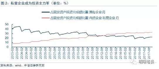 私营企业成为主力军,对经济的拉动效应不言而喻。私营经济体量的壮大自然带来了投资需求,2003年以来的数据显示,私营企业占固定资产投资完成额比重持续攀升并于2013年超越国有企业成为固定资产投资的最大内容。而回看历史数据可以发现,虽然2008~2009年的经济强刺激措施推动了国有企业固定资产投资占比,但这一阶段私营企业固定资产投资完成额占比并没有受到严重削弱,所谓的挤出效应并不显著。