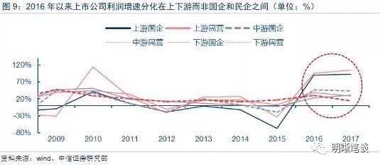 国有企业和民营企业的分化和对立在上市公司样本范围内并没有显著的表现。根据上下游行业和所有制形式将当期上市公司划分为上游国企、上游民营、中游国企、中游民营、下游国企、下游民营六大类,分别计算六大类上市企业营业利润(合计)的增速,结果并不支持国企表现明显好于民企的观点。2016年以来的确出现了上游企业营业利润增速大幅上涨的现象,与之相对应的是中下游行业企业饮料增速的微涨,这一现象印证了前文所述的PPI上涨拉动上游企业利润增速上行。但是我们同时发现,同处于上游企业的国有企业和民营企业的表现几乎相同,甚至民营企业表现更优于国有企业,2016年上游国企营业利润增速为90%,上游民企则达到96%;2017年上游国企营业利润增速上行至93.6%,而上游民营企业增速提高到105.9%。