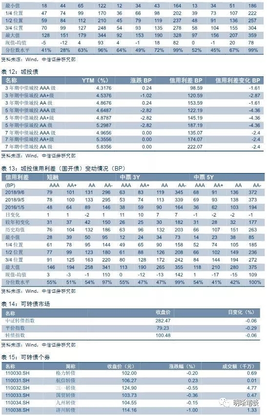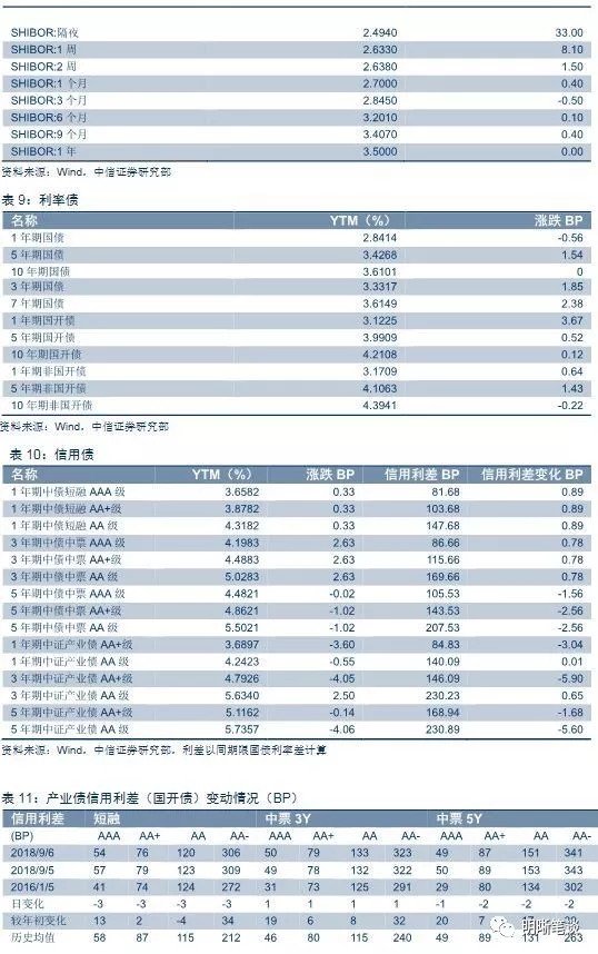 9月6日,债券收益率短端走平,中端上行。其中AAA中票1Y走平,3Y上行3BP,5Y走平;AA中票1Y走平、3Y上行3BP、5Y下行1BP;AA-中票1Y走平、3Y上行3BP、5Y下行1BP。