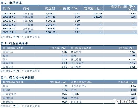 2018年9月12日,银银间质押回购加权大体下行,隔夜、7天、14天、21天分别变动-4.34BP、-1.1BP、-3.45BP和25.37BP至2.53%、2.66%、2.71%和3.04%。当日国债收益大体下跌,1年期、3年期、5年期、10年期国债分别变动0.33BP、-0.31BP、1.15BP、-2.00BP至2.85%、3.42%、3.52%、3.66%。上证综指收跌0.33%至2656.11,收跌0.70%至8111.16,收跌0.67%至1385.80。