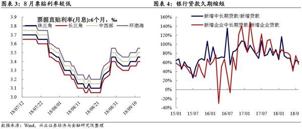 银行放贷意愿较弱,风险偏好仍低的三个证据。8 月新增人民币贷款 1.28 万亿,较上月减少 1700 亿。贷款结构方面,1)从贷款主体来看,银行仍然更偏好居民贷款。新增企业贷款从 7 月的 6501 亿继续下行至 6127 亿,新增居民贷款则从 7 月的 6344 亿上升至 8 月的 7012 亿。2)从企业贷款形式来看,银行更为偏好票据融资。新增企业票据融资较 7 月大增 1711 亿,连续 5 个月扩张,短贷和长贷则有所减少。指向在资金面宽松的背景下,银行风险偏好仍弱,倾向于以票贴的形式填充额度。结合 8 月社融中未贴现票据的反弹,以及 8 月票贴较低,企业融资需求更多地通过票据融资来实现。3)从贷款期限来看,银行贷款久期仍表现出缩短的趋势。8 月企业新增中长期贷款占新增企业的比重为 55.9%,为 16 年 11 月以来的最低值。