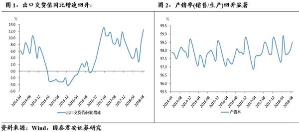 8月以来,经济动能基本平稳,工业增加值同比增速小幅回升0.1个点。这其中固然有17年同期低基数的作用,但也不能忽视需求的拉动。本月出口交货值增速大幅加快近4个点至12.5%,产销率(销售/生产)上升0.5个点至98.5%。在美国经济强劲、短期贸易摩擦进入缓冲期的阶段,外需短期内对我国整体生产继续形成拉力。